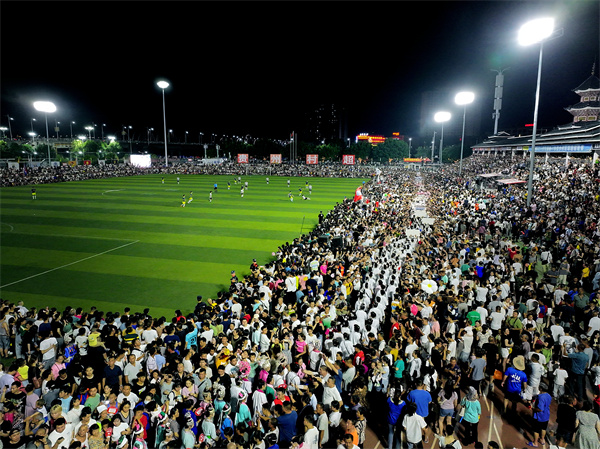 “球进啦!”6月17日“超级星期六”,在榕江县城北新区体育馆,欢呼声响彻夜空,属于每位球迷的足球盛宴——“村超”正在火热进行。
