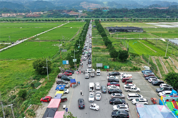 “村超”火,旅游热,7月9日,在贵州省榕江县三宝侗寨古榕群景区门前,等待游客的汽车排成长龙。(杨文舒 摄)