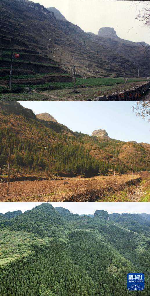 这是一张拼版照片,从上至下分别为:毕节市大方县羊场镇穿岩村沙坝退耕还林前的坡耕地(资料照片,大方县林业局供图);2009年3月14日拍摄的毕节市大方县羊场镇穿岩村沙坝退耕还林实施过程中的坡耕地(大方县林业局供图);2022年6月2日拍摄的毕节市大方县羊场镇穿岩村沙坝风貌(新华社记者陶亮摄)。新华社发