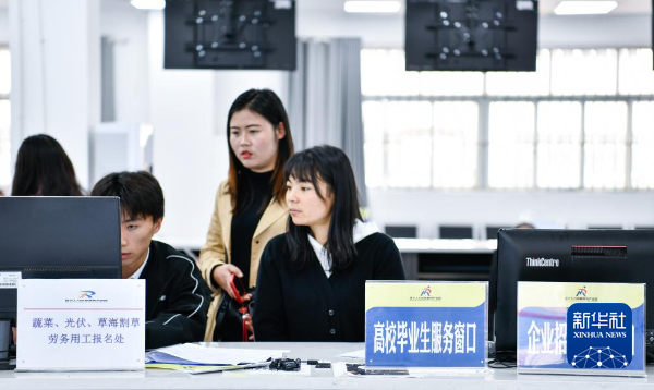 在贵州省威宁县人力资源服务产业园企业招聘和高校毕业生服务窗口,招聘企业人员在登记招聘信息(7月19日摄)。新华社记者 杨文斌 摄
