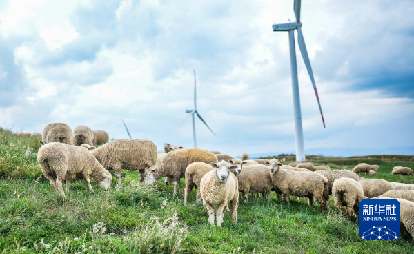 毕节威宁县雪山镇村民饲养的羊群在风力发电设备下的草场吃草(7月13日摄)。新华社记者 陶亮 摄