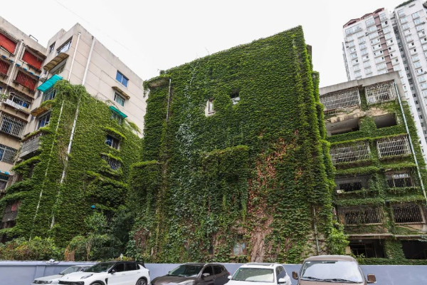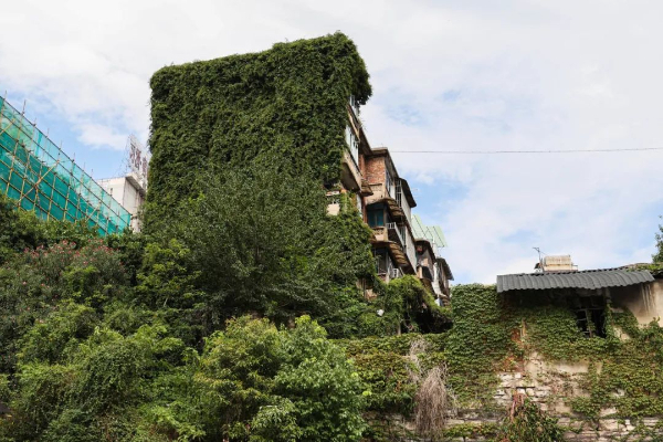 在车水马龙之间茂密的绿植“爬上”老房墙面默默装点着“水泥森林”