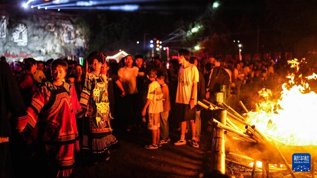 当地群众和外地游客在篝火旁欢庆火把节(8月10日摄)。新华社记者 陶亮 摄