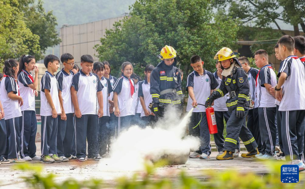 8月21日,消防员在贵州省铜仁市玉屏侗族自治县黔东民族寄宿制中学指导学生使用灭火器灭火。新华社发(胡攀学 摄)