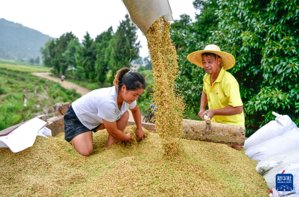 陈良东和儿媳将收割的稻种装车(8月26日摄)。新华社记者 杨文斌 摄
