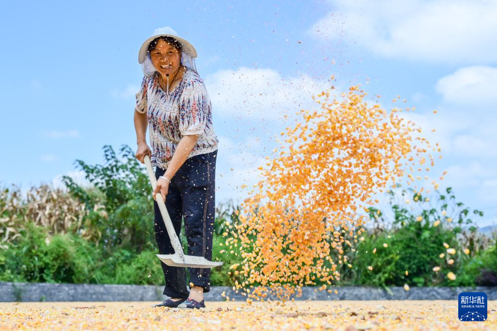 9月5日,村民在贵州省毕节市百里杜鹃管理区中塘村广场晾晒农作物。新华社发(李华 摄)