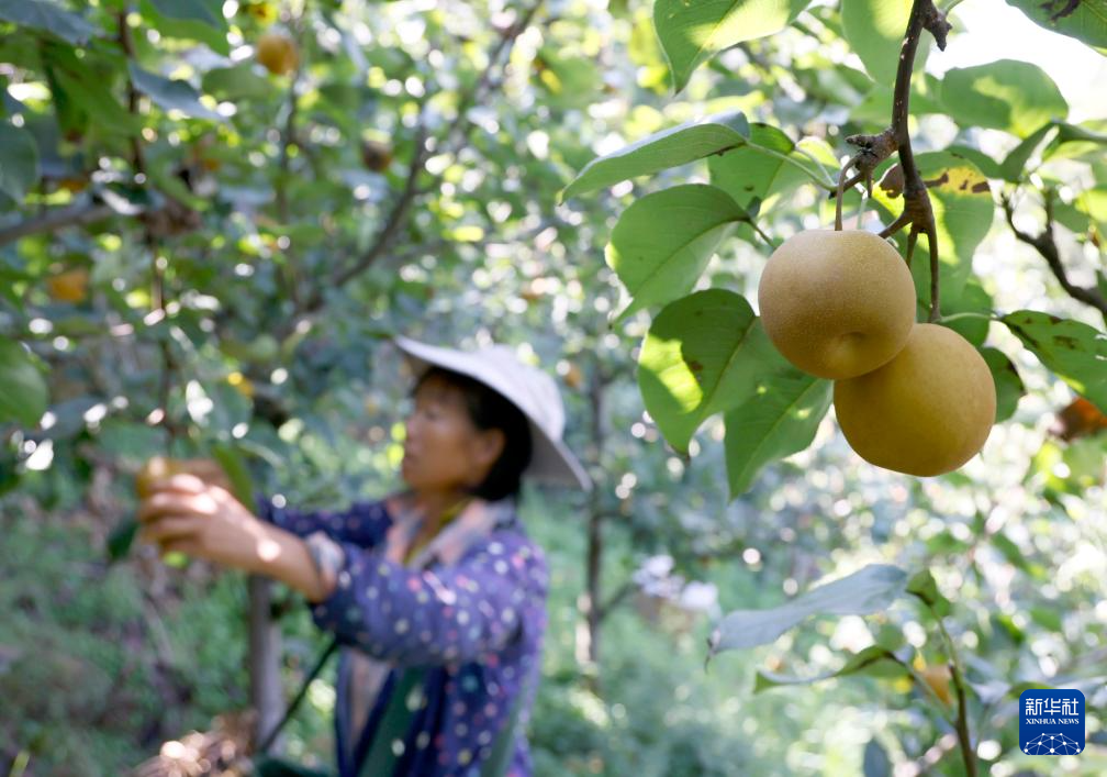 9月5日,果农在贵州省汇川区团泽镇三联村水果种植基地采摘鲜梨。新华社发(田锦泓 摄)