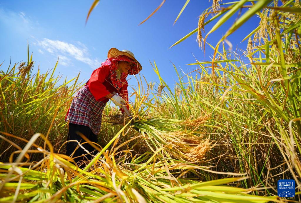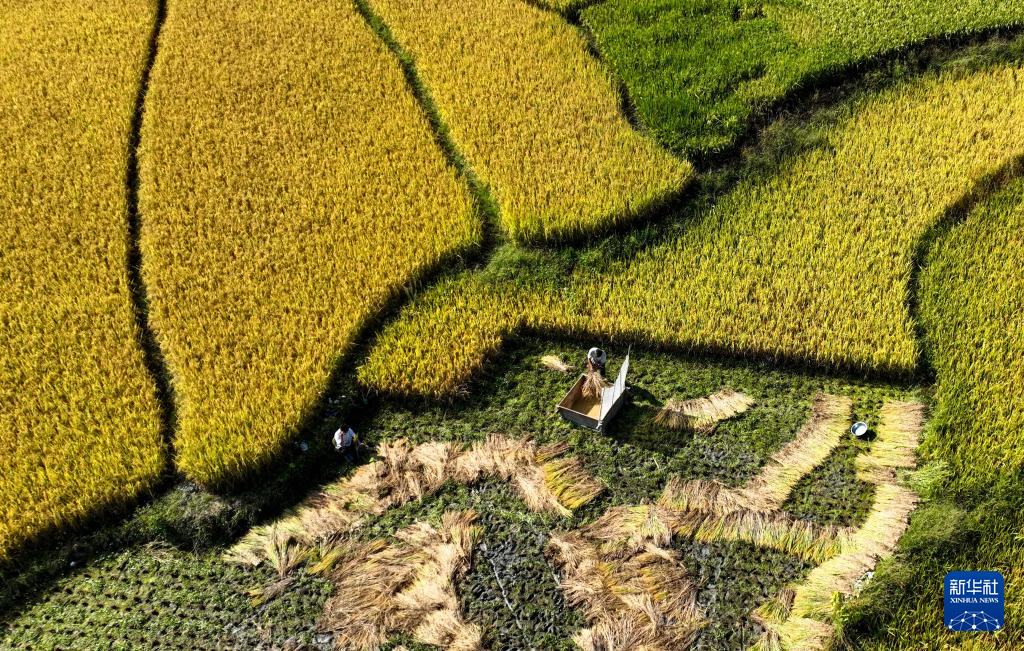 9月5日,村民在贵州省黔东南苗族侗族自治州丹寨县龙泉镇交圭村稻田里收割水稻。新华社发(杨武魁 摄)