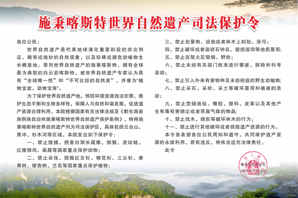 9月4日,施秉县法院发出《施秉喀斯特世界自然遗产司法保护令》,“禁止猎捕、损害白颈长尾雉、猕猴、虎纹蛙、红腹锦鸡、画眉等国家重点保护动物;禁止采伐、损毁红豆杉、穗花杉、三尖杉、香果树、银杏树、兰花等国家重点保护植物……”该令共有禁止类条款11条,还包括禁止损毁石钟乳等溶洞景观;野炊、吸烟等野外用火;擅自攀崖、探险;引入外来有害物种及未经检疫的野生动植物;采石、采土等破坏景观活动;焚烧塑胶、皮革等物品;伐木、烧炭和其他损毁遗产资源的行为等。