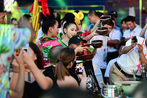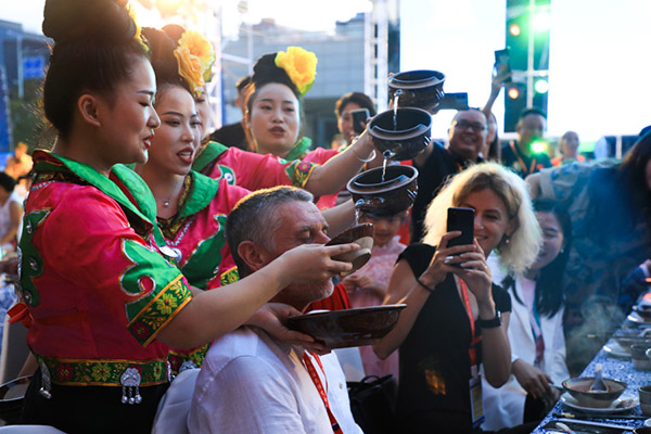 现场,长桌宴上摆满了酸汤江团、豆腐蔬菜拼盘、卤菜拼盘,土豆辣子鸡、赤水竹笋烧腊排骨等特色美食,让人馋涎欲滴,随着侗族大歌《天地人间充满爱》、苗族舞蹈《锦鸡舞》等特色节目轮番上演,宾客们一边品尝特色美食,一边欣赏民俗表演,精彩的节目让嘉宾们不时响起掌声和喝彩声。随后,苗家姑娘们人手拿一个酒碗,从高往低依次排开倒酒,酒从上而下流入嘉宾口中,形成“高山流水”的场面,十分壮观,嘉宾们直呼过瘾。