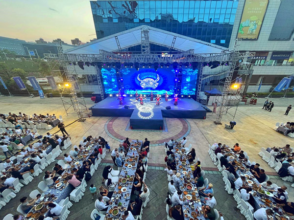 9月9日18时,“食全酒美”长桌宴在贵阳西南国际商贸城财神广场热闹开启,300余位嘉宾在一起品地方特色美食,共享长桌盛宴,共观民俗表演。