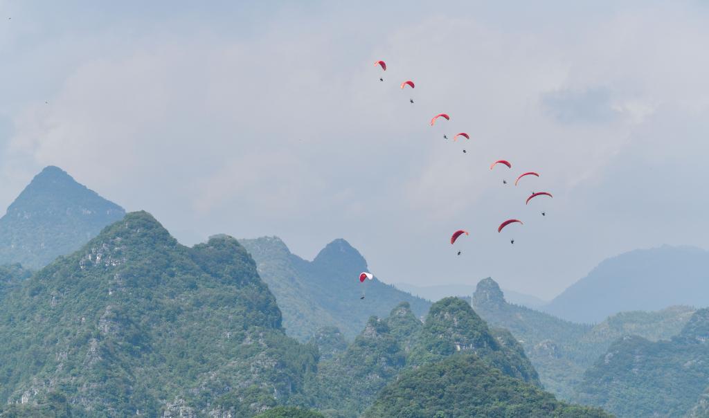 9月16日,运动员在开幕式上进行滑翔伞表演。新华社记者 杨文斌 摄