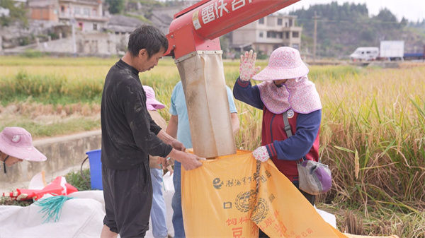 走进五兴坝区,放眼望去,色泽金黄、颗粒饱满的稻穗铺满田野,微风拂过,连片的稻穗不时掀起金色细浪,空气里弥漫着阵阵谷物清香,农机手正在操作着收割机在金色的稻浪中来回穿梭作业,伴随着收割机的轰鸣声,一片片金黄的水稻整齐倒下,脱粒、碎秆一气呵成,沉甸甸的稻穗转眼间变成稻谷装入车中,村民们把刚收割的新鲜稻谷收入袋子后抓紧时间运回家中进行翻晒。