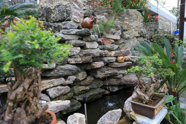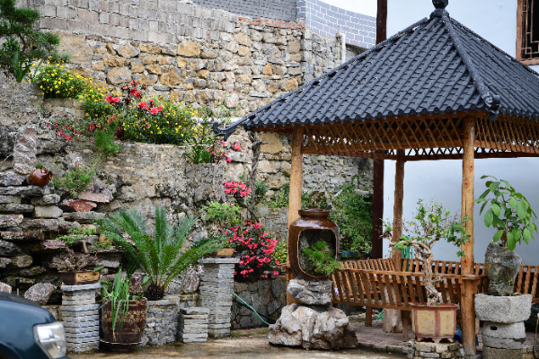 “好多奇石和树桩都是自己多方‘淘’来的,想着把自家环境搞好了,住着舒服,于是就自己动手开干。”经营着一家夜市摊的周朋伟对改造院子是有些执拗劲在身上的,“我这个人有点‘犟’,一些小景做好了觉得不满意,便又推倒重来,直到自己满意为止,前后花了三年时间打造。”