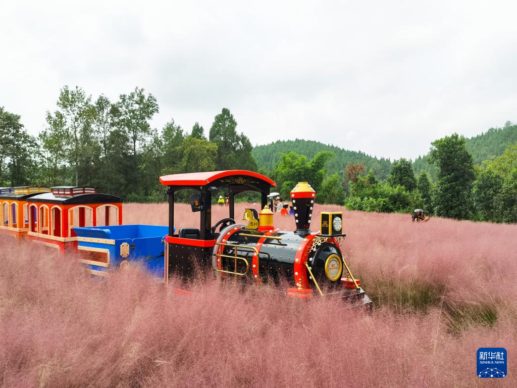 9月26日,在位于贵州省遵义市的贵州农博园里,一辆小火车停靠在粉黛乱子草园里。