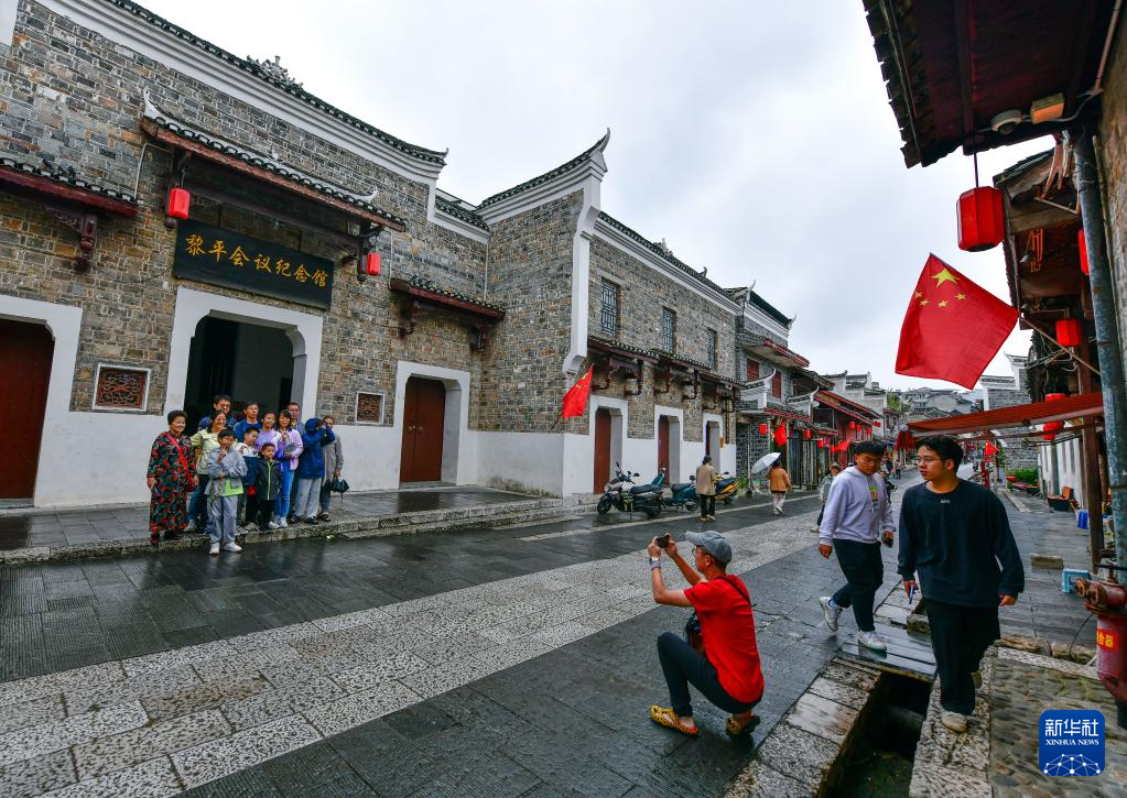 10月5日,游客在贵州省黎平县黎平会议纪念馆前留影。