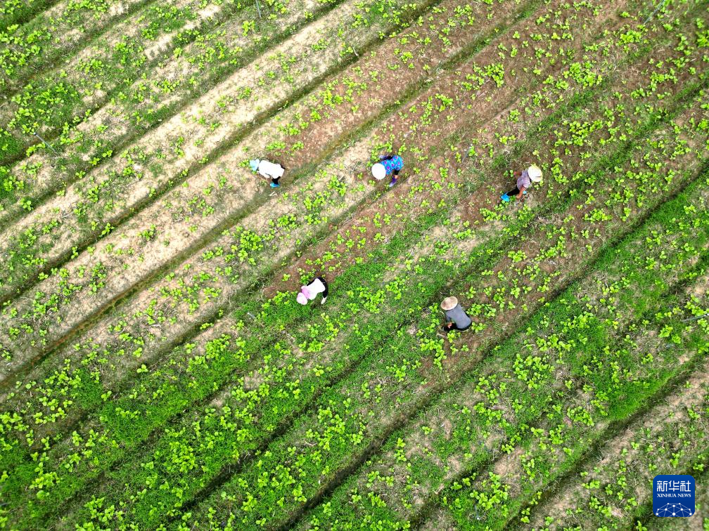 9月26日,村民在贵州省黔东南苗族侗族自治州榕江县车江坝区蔬菜基地进行田间管理(无人机照片)。