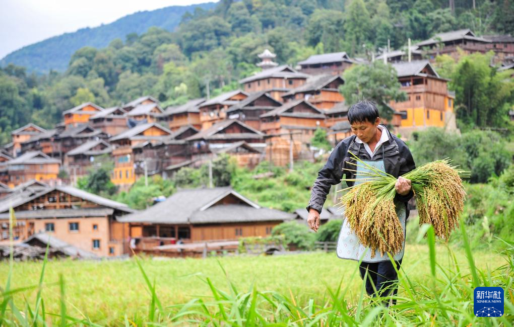 10月7日,村民在贵州省黔东南苗族侗族自治州从江县高增乡占里村的田间搬运糯稻。