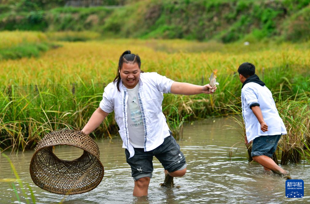 10月5日,贵州省黎平县双江镇黄岗村的年轻人在秋收后的稻田里抓鱼。
