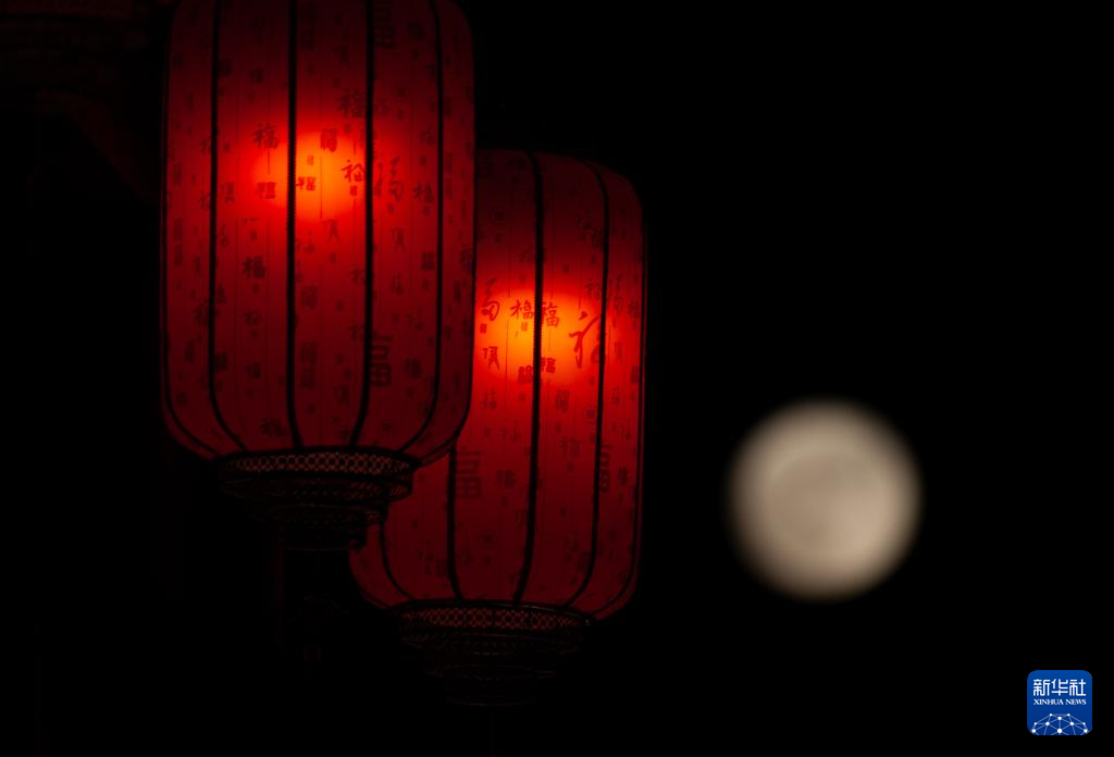 这是9月29日在贵州省黔东南苗族侗族自治州丹寨县万达小镇拍摄的仿古灯笼和圆月。