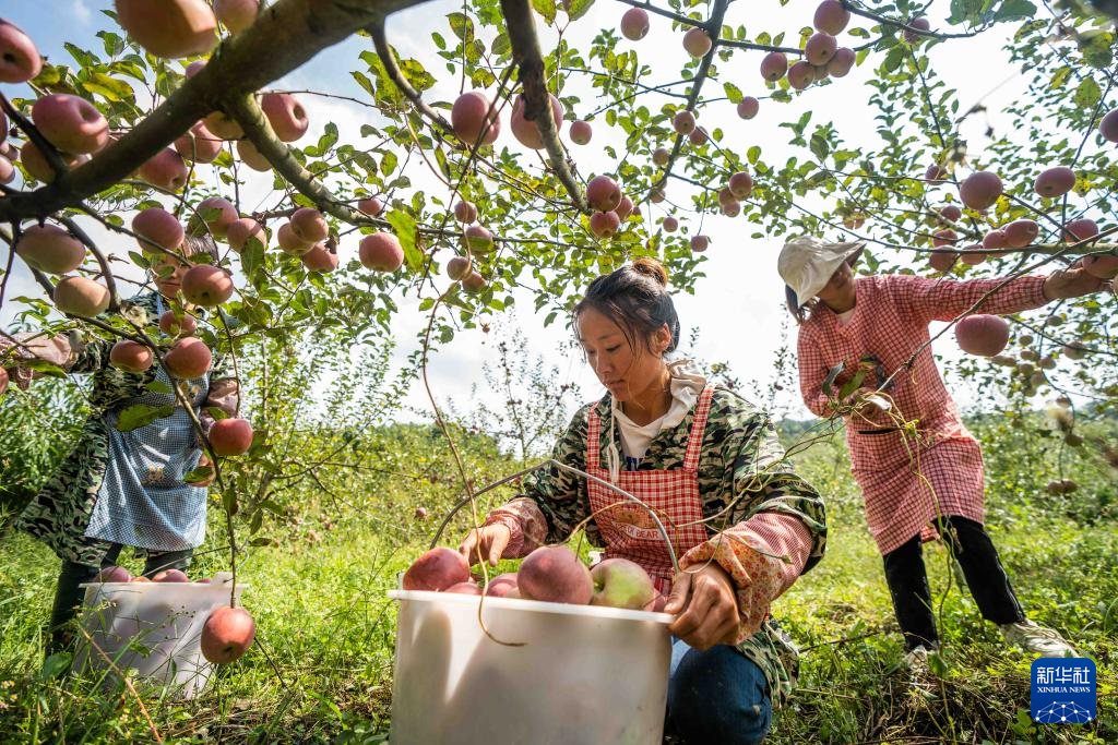 近日,贵州省毕节市威宁彝族回族苗族自治县各地苹果陆续成熟,果农们抢抓农时采摘,供应市场。近年来,当地依托独特地理气候优势,发展“糖心”苹果种植20余万亩,年产量近20万吨,年产值超过10亿元。
