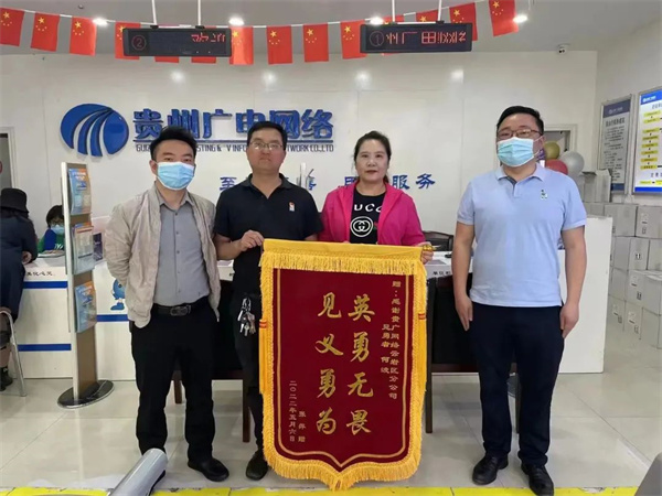2022年5月4日,获救人员的母亲张女士凭借何波当天身穿工作服上的“贵广网络”字样找到了他。为表达心中的感激之情,张女士专门定制了一面印有“英勇无畏 见义勇为”八个大字的锦旗,并于5月6日送到了何波手中。