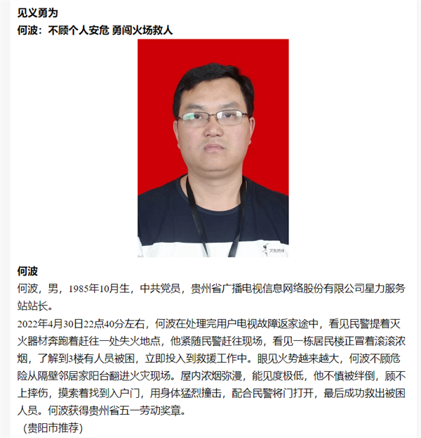 2022年6月,经云岩区政府研究决定授予何波同志云岩区见义勇为先进个人称号。