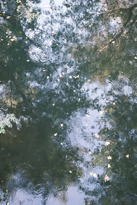 落叶如小舟散落在潺潺溪流