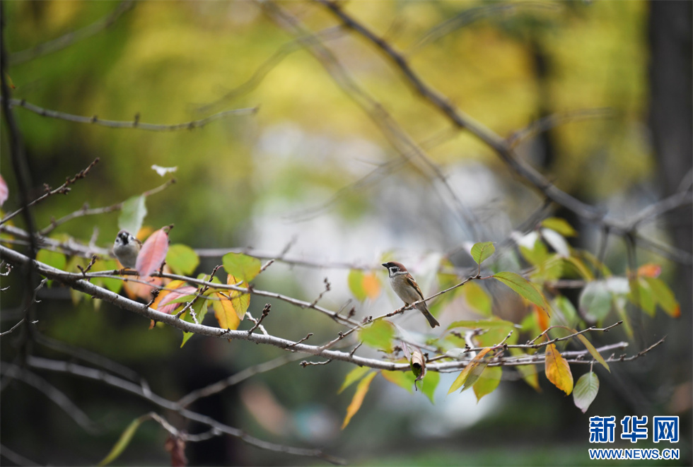 在筑城广场的景观树上,两只麻雀正在觅食(11月7日摄)。新华网发(赵松 摄)