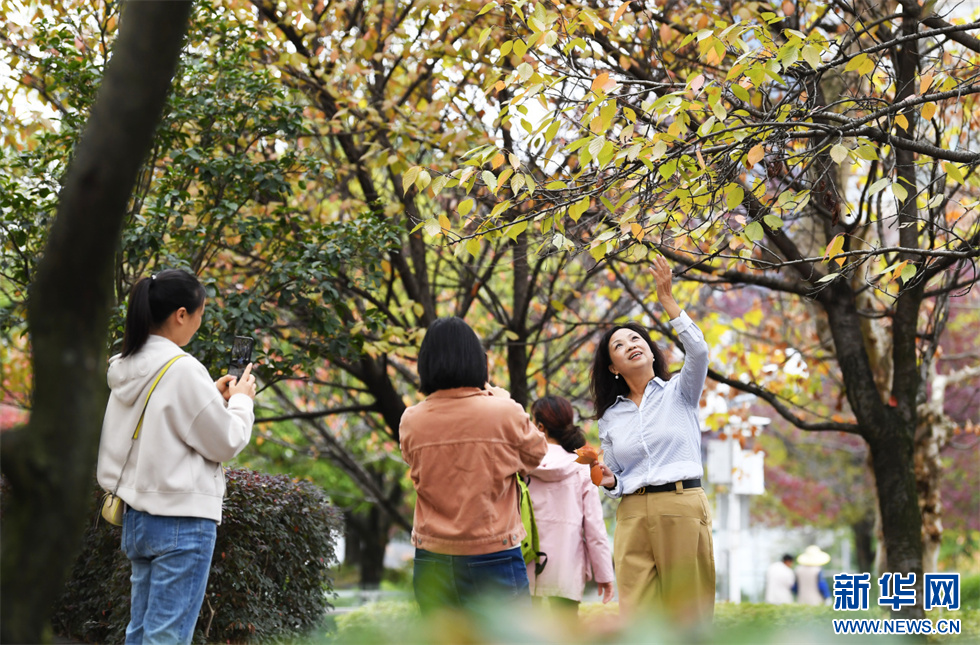 市民在筑城广场逐渐变黄的景观树下拍照(11月7日摄)。新华网发(赵松 摄)