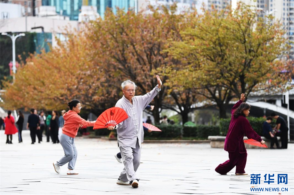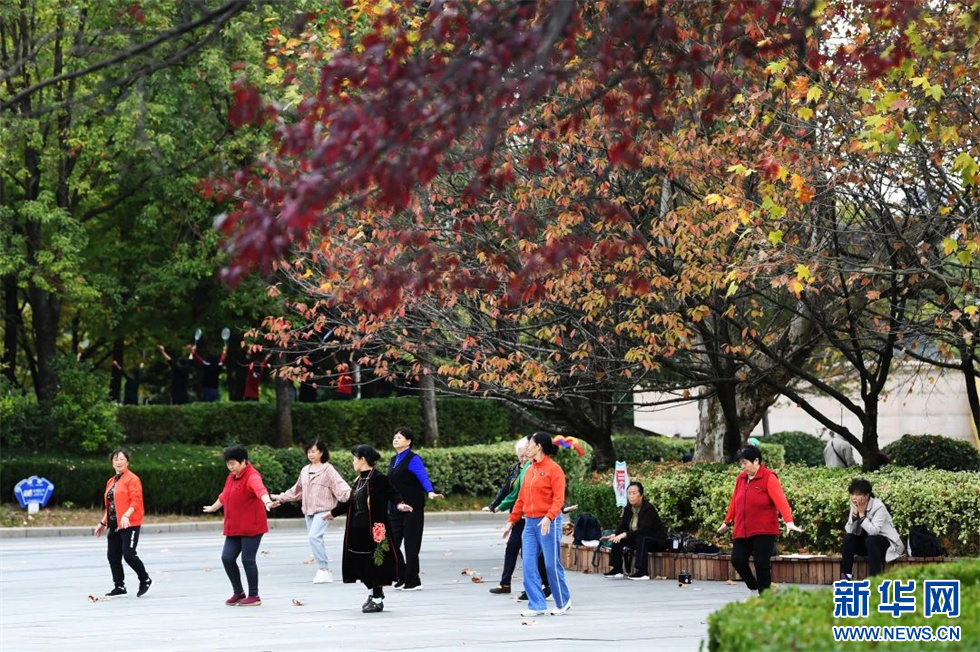 市民在逐渐变红的景观树下晨练(11月7日摄)。新华网发(赵松 摄)