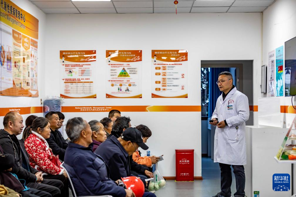 11月14日,医生在贵州省黔西市人民医院东桥路院区国家标准化代谢性疾病管理中心为前来就诊群众宣传糖尿病知识。新华社发(范晖 摄)