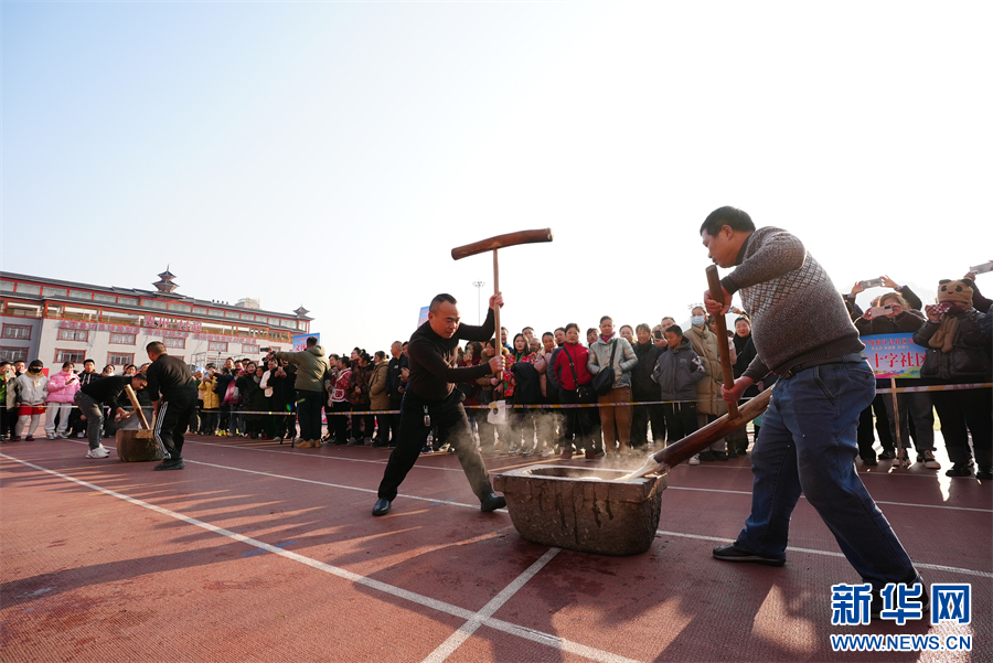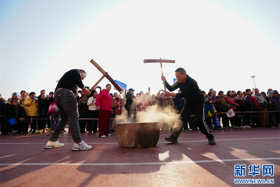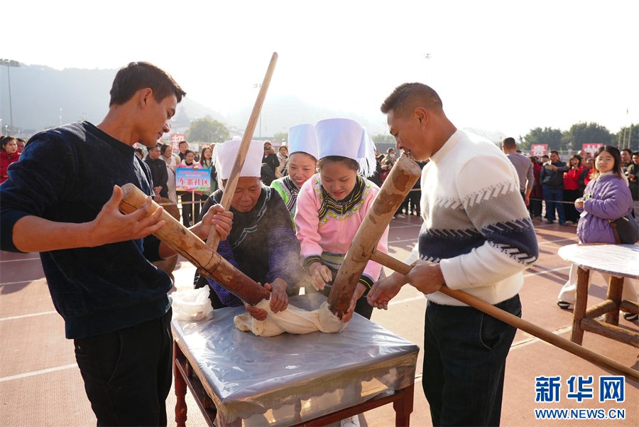 12月24日,在榕江县贵州“村超”球场,选手们在进行打糍粑项目比赛。新华网发(韦贵金 摄)