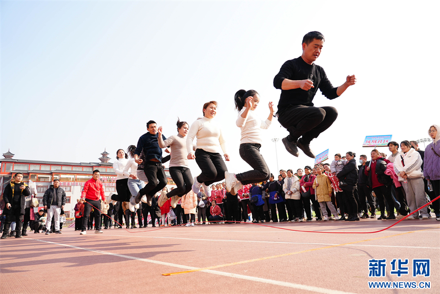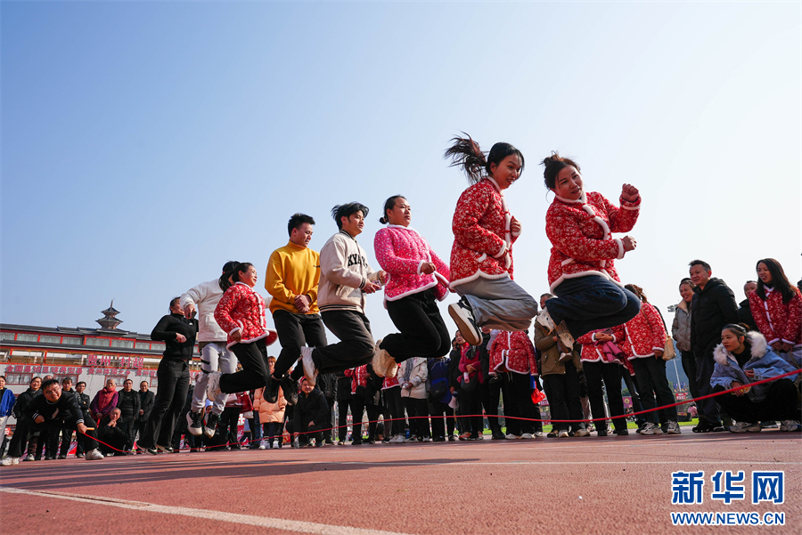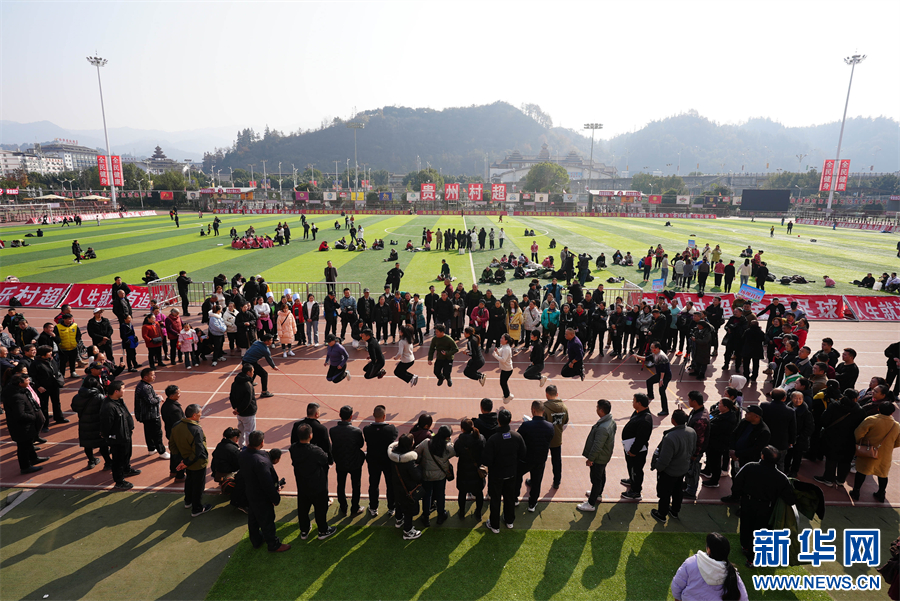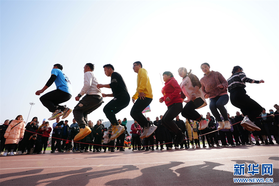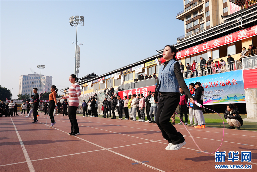 12月23日,在贵州省榕江县“村超”球场,参加集体跳绳项目的选手们。新华网发(韦贵金 摄)