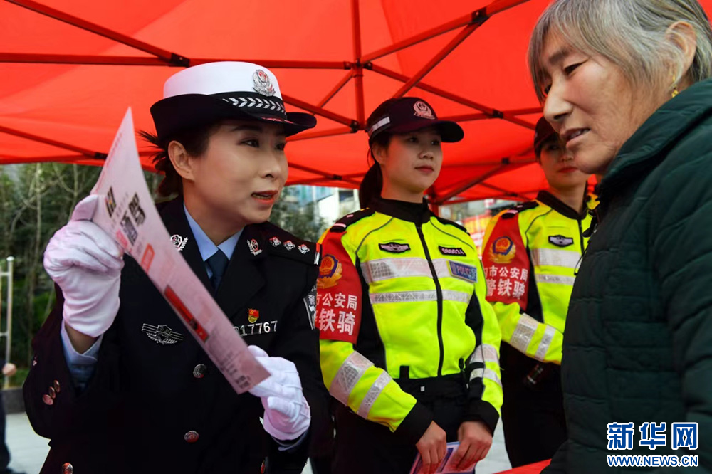 1月10日,一名交通民警在贵州省黔南布依族苗族自治州都匀市人民广场向市民普及交通安全知识。新华社记者 杨楹 摄