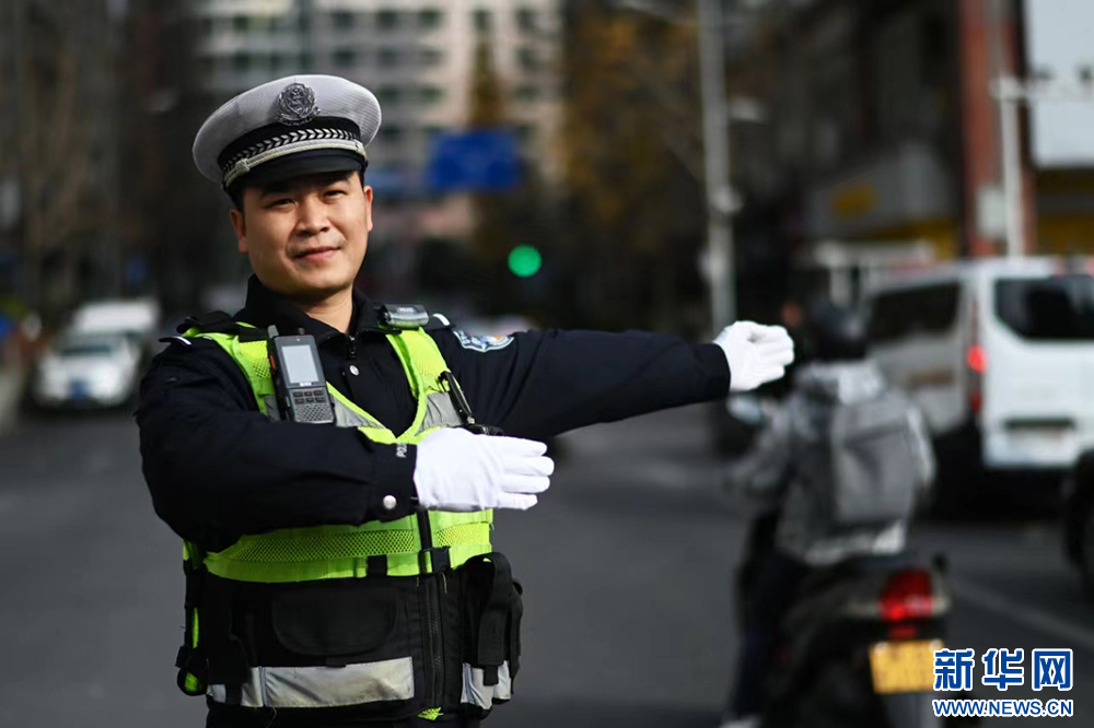 1月10日,一名交通民警在贵州省黔南布依族苗族自治州都匀市城区街道指挥交通。新华社记者 杨楹 摄