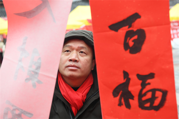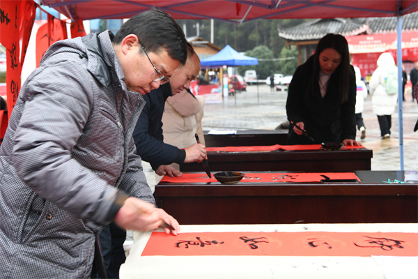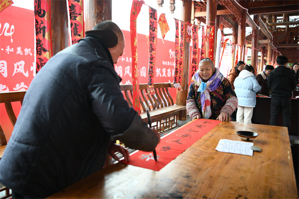 2月2日,贵州省凯里市2024年送春联、拍全家福活动走进凯里苗侗风情园,书法家在义务给市民书写春联。(杨仁海 摄)