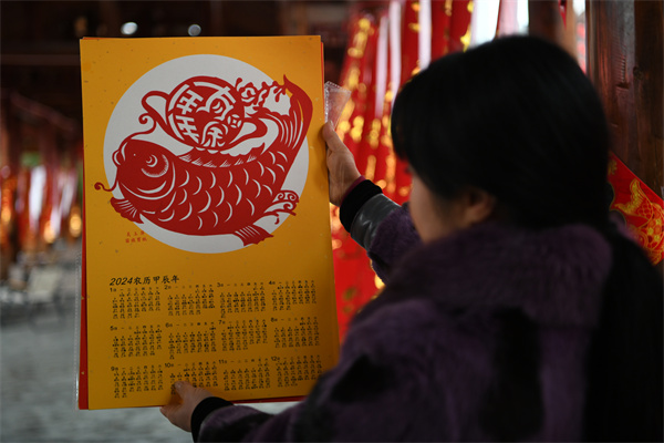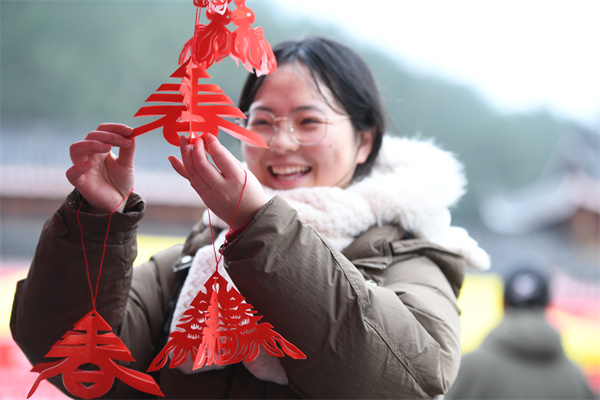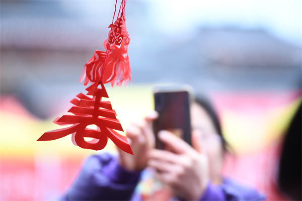 2月2日,贵州省凯里市2024年送春联、拍全家福活动走进凯里苗侗风情园,一市民对剪纸作品进行拍照。(杨仁海 摄)