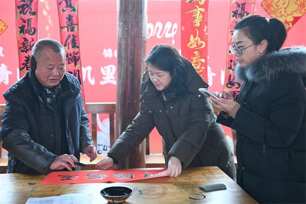 2月2日,贵州省凯里市2024年送春联、拍全家福活动走进凯里苗侗风情园,一老师(左二)在示范操作剪纸作品。(杨仁海 摄)
