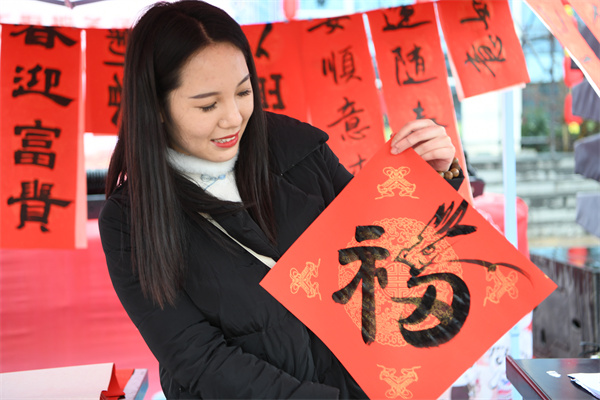 韦梅说,这些剪纸和春联,是当地艺术家们亲手剪的写的,相对印刷的更能够体现过年的氛围,过年的时候贴在大门上、讨个好彩头,激发和培养孩子写毛笔字、学剪纸的兴趣,传承和弘扬中国传统文化。
