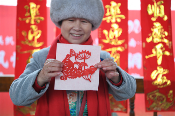 吴玉萍巧用偕音和多种裁剪手法,将年年有余、花开富贵、滚滚来财等中华吉祥传统文化符号融入画面,栩栩如生,寄寓对新年满满的祝福和期许。