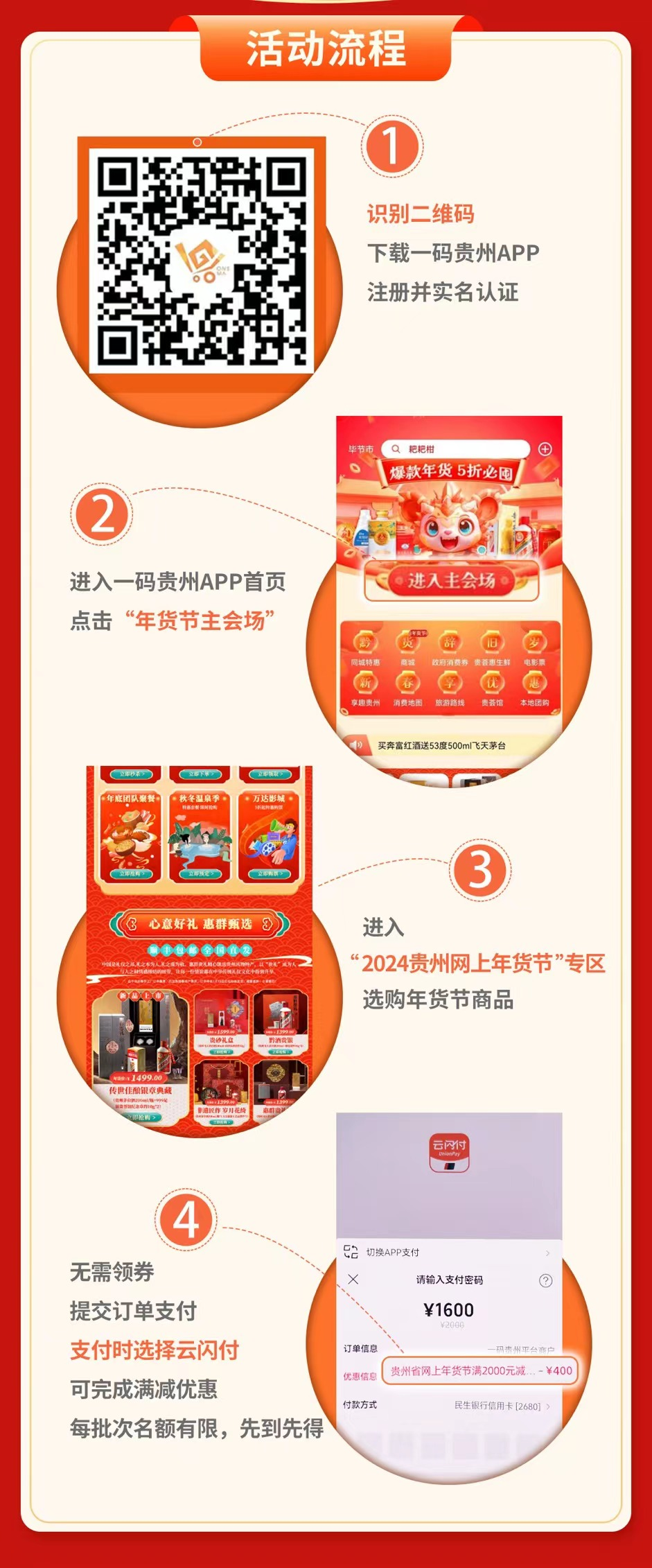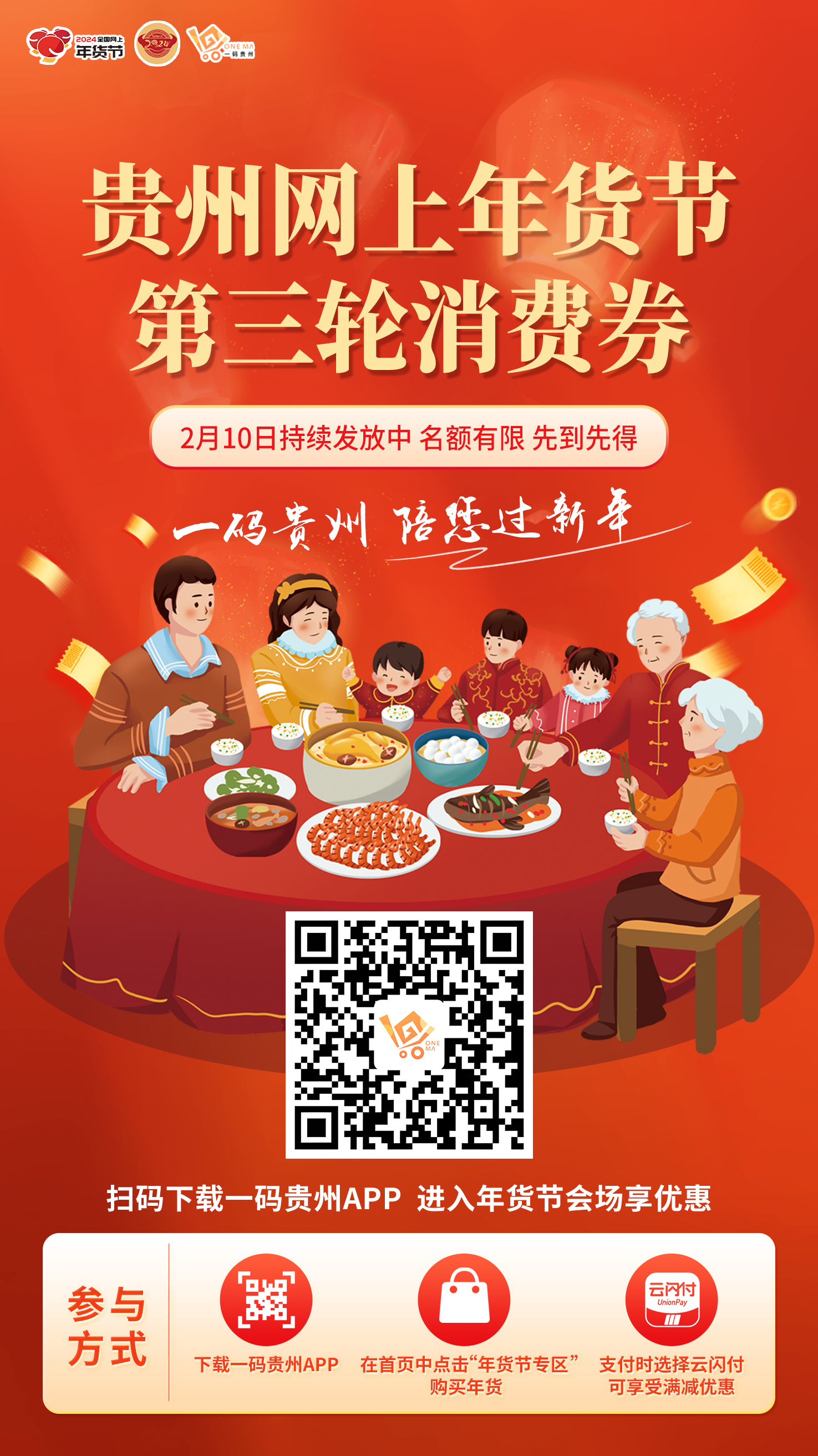 黔货辞旧岁·新春享优惠!“2024贵州网上年货节”第三轮消费券将于2月10日起发放,涵盖贵州特产、白酒、餐饮、旅游等3500余个商品。消费者在“一码贵州”APP年货节专区选购商品,支付时选择云闪付,即可享受消费券带来的满减优惠。