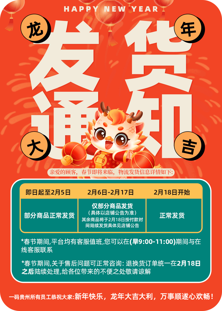 一码贵州平台运营崔健介绍道:“春节期间,关于商品发货事宜,具体以店铺公示为准。部分商品将于2月18日起,按订单顺序陆续发货,消费者在购买商品前请及时了解发货详情。为满足相关订单咨询,消费者可在每天上午9:00至11:00咨询在线客服。”