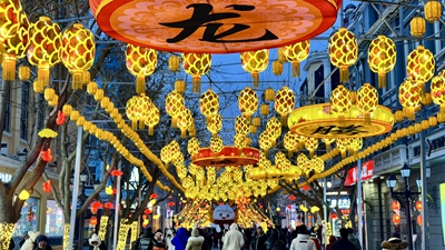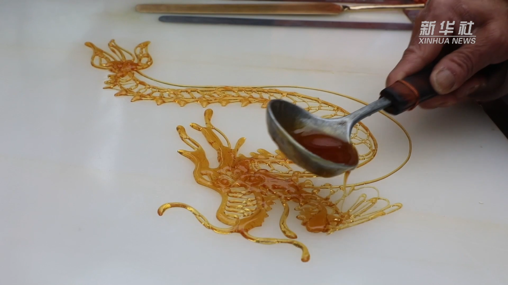 以勺为笔、以糖为墨,在大理石板上,糖画手艺人凭借一勺糖汁绘制糖画。抖、顿、放、收……只见其手法熟练,飞快地来回浇铸。不一会儿,祥龙造型的糖画便腾空出现,传递出甜甜的年味。