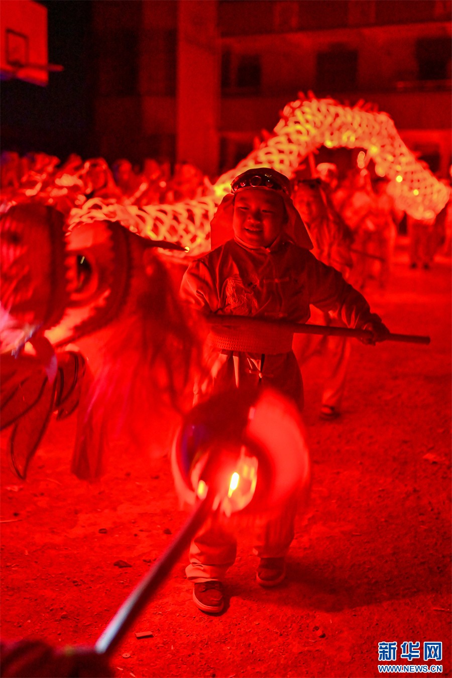 2月19日,小朋友参加贵州省毕节市百里杜鹃管理区百纳乡舞龙巡游表演。新华网发(李华 摄)