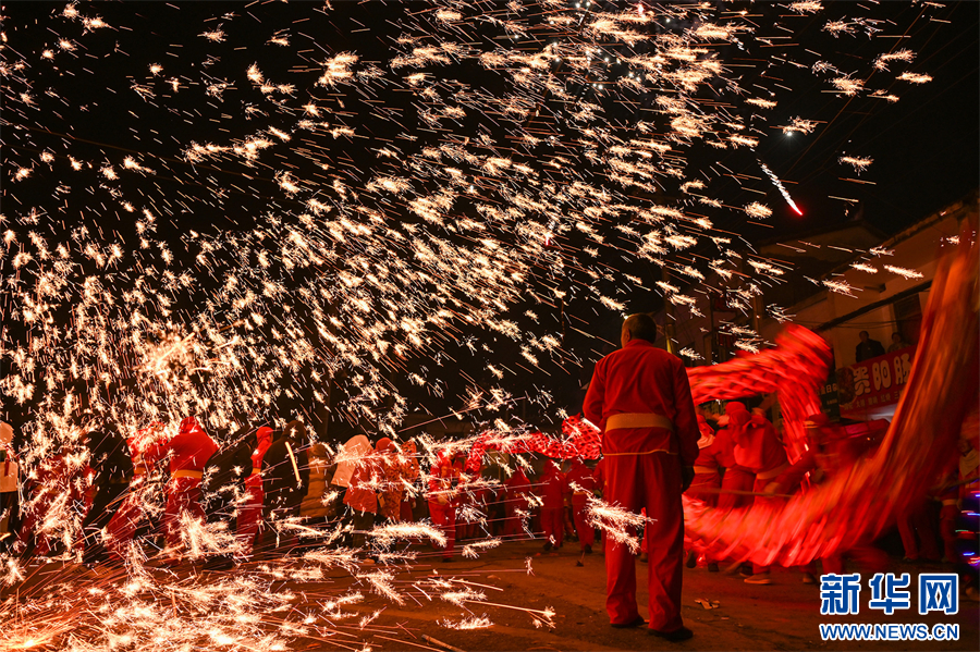 2月19日,人们观看贵州省毕节市百里杜鹃管理区百纳乡打铁花表演。新华网发(李华 摄)