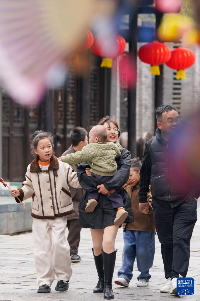 2月21日,游客在贵州省黔东南苗族侗族自治州丹寨县万达小镇景区游玩。新华社发(杨胜贤 摄)