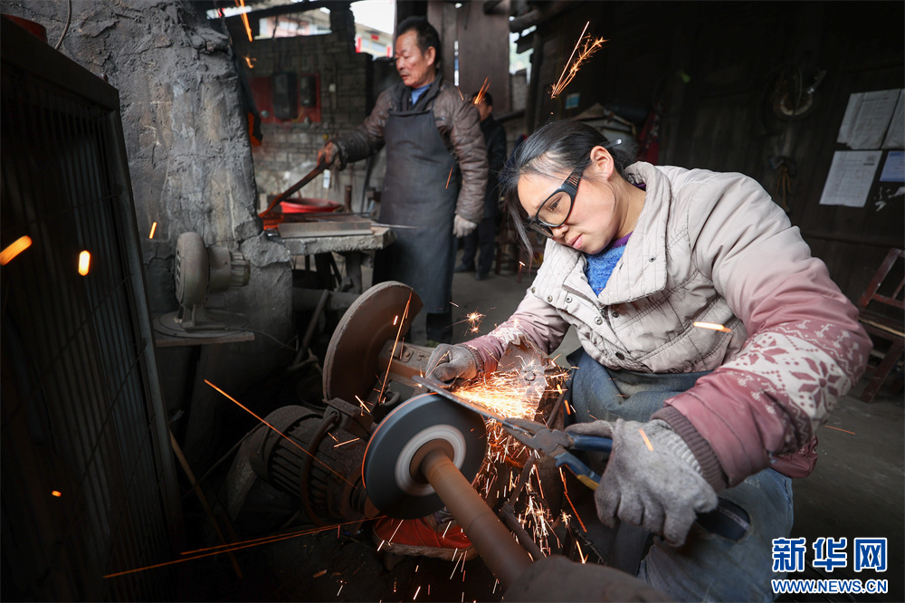2月29日,工匠在贵州省黔东南苗族侗族自治州丹寨县龙泉镇白元村打磨镰刀。