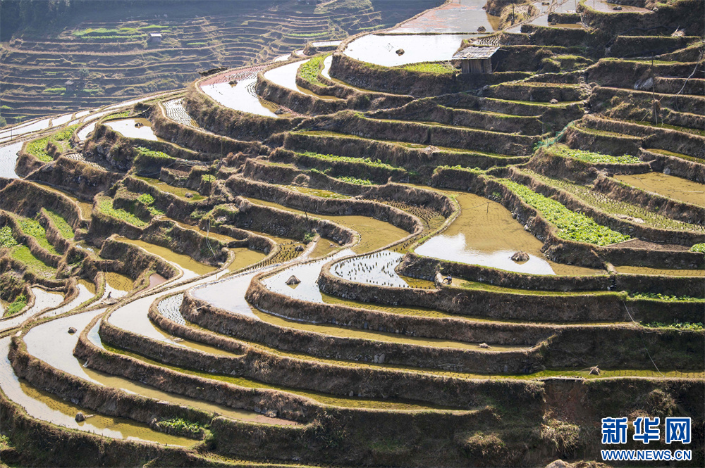 春日时节,位于贵州省黔东南苗族侗族自治州从江县加榜乡境内的加榜梯田蓄水丰盈,层层叠叠的梯田与辛勤劳作的农民身影构成了一幅美丽的农耕画卷。