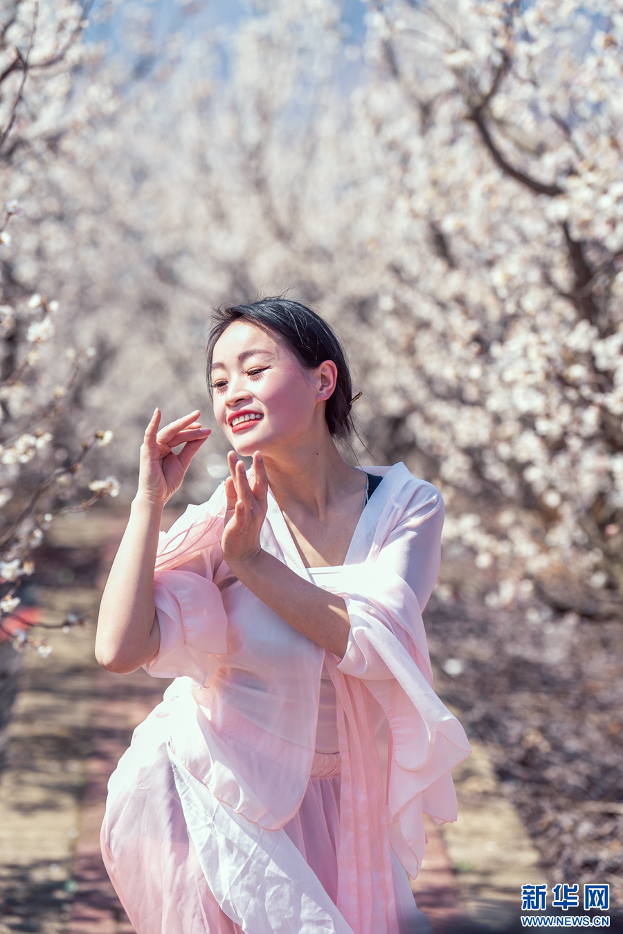 游客在贵州省毕节市纳雍县厍东关乡陶营村樱桃花中跳舞(3月4日摄)。新华网发(罗大富 摄)